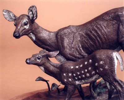 The sculpture "Awakening the Dawn" shows a doe and fawn.